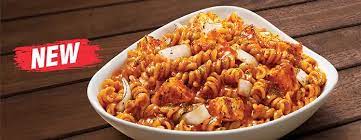 Instant Fusilli Pasta, Spicy Red dressing, Onion, Paneer Tikka, Parsley sprinkle