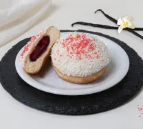 A red cherry filled doughnut, coated in a white vanilla cream, topped with vanilla cake crumbs and sprinkled red sugar, a vanilla twist to the classic